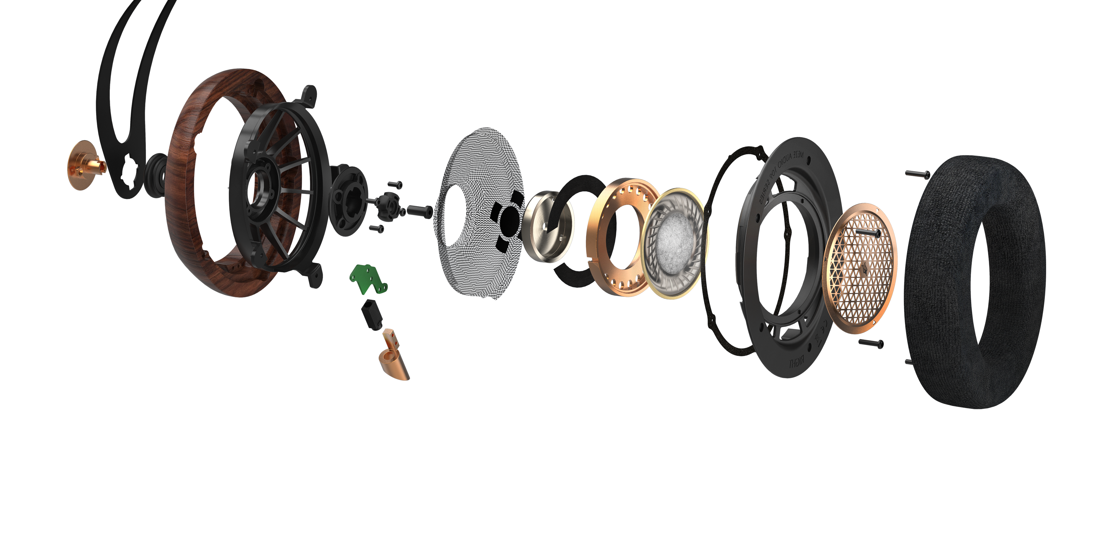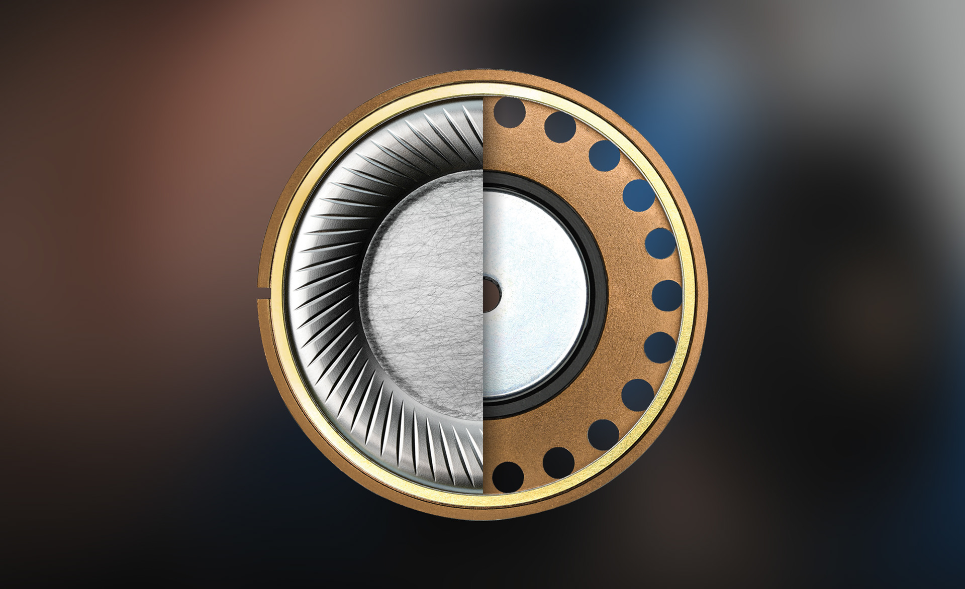 The quest for maximizing the sonic abilities of the headphone started with the diaphragm, where we focused on finding the perfect balance between mass and stiffness. Our research led to developing the 109 series Dual-Composite Diaphragm - a combination of Beryllium-coated polymer and cellulose-carbon fiber composite. The diaphragm is encased in a high-precision aluminum frame, together with the neodymium magnet. Manufactured using CNC machining, the frame offers superior rigidity, strength, and thermal stability to retain surface flatness.